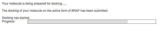 When you are ready to predict the binding mode of the ligand you have designed, docking computation is launched on a remote computer thanks to the Internet (tens of thousands of different geometries and positions of the ligand in the protein are evaluated by using AutoDock Vina!). A page showing the procedure's progress is displayed. If all the docking processors are being used, the length of the waiting list is indicated (i.e. the number of procedures expected before yours takes place). Once it's free, computation per se begins and a progress bar is displayed.